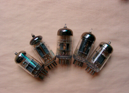 几种在音频放大器里常用的电子管图示六: 五颗前置电压放大管:6N10,12AX7,12AU7,12AX7,12AU7