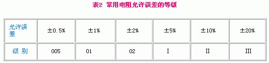 大多数电阻上,都标有电阻的数值,这就是电阻的标称阻值。电阻的标称阻值,往往和它的实际阻值不完全相符。有的阻值大一些,有的阻值小一些。电阻的实际阻值和标称阻值的偏差,除以标称阻值所得的百分数,叫做电阻的误差。表2是常用电阻允许误差的等级。
