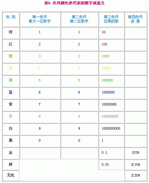 碳质电阻和一些1/8瓦碳膜电阻的阻值和误差用色环表示。在电阻上有三道或者四道色环。靠近电阻端的是第一道色环,其余顺次是二、三、四道色环,如图1所示。第一道色环表示阻值的最大一位数字,第二道色环表示第二位数字,第三道色环表示阻值未应该有几个零。第四道色环表示阻值的误差。色环颜色所代表的数字或者意义见表1。