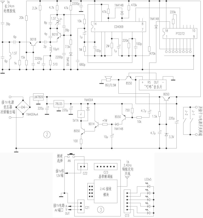 图2是315MHz编码信号接收解调及控制电路。315MHz编码信号经高放和超再生解调后送入CD4069放大整形,然后由PT2272解码输出一高电平去触发音乐IC,发出“叮咚,叮咚”的门铃声。同时,铃声信号将控制电路接通,继电器J动作,电视机总电源接通工作。本控制电路中也设有延时电路,约55秒钟后,继电器释放,电视机总电源切断,重新处于待机状态。注意解码块PT2272的地址码必须与编码块PT2262的地址码完全相同。